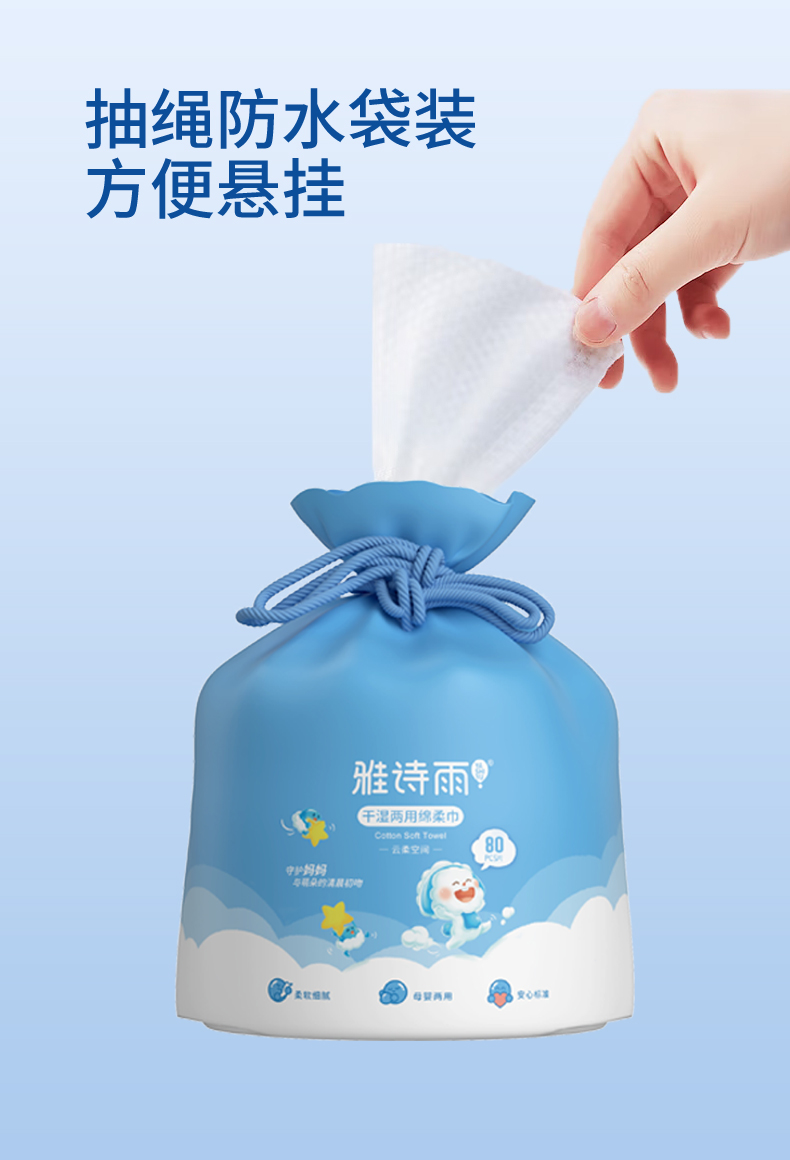 这款雅诗雨洗脸巾,可干湿两用,并且封口处采用抽绳防水设计。布料柔软贴合肌肤,无任何刺激性成分,不掉毛不掉絮,十分好用。点断式切口,轻松好撕,使用方便